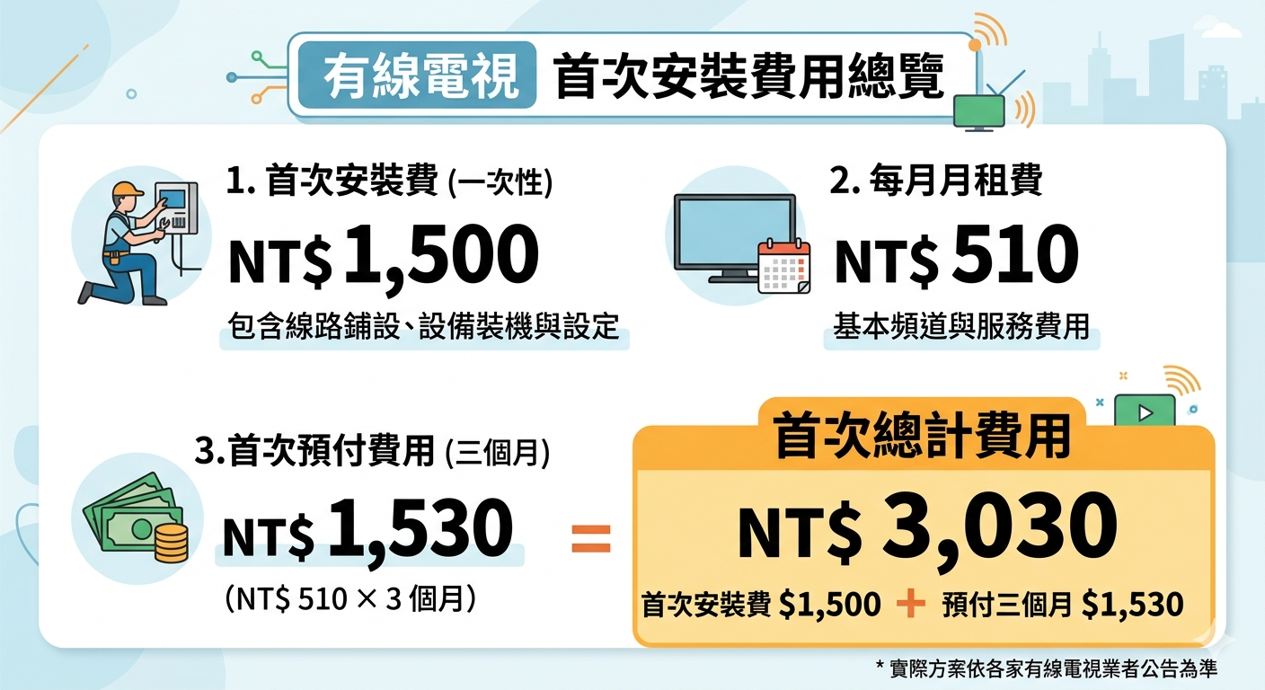 首次安裝費:1,500元,基本有線電視月租費:510元